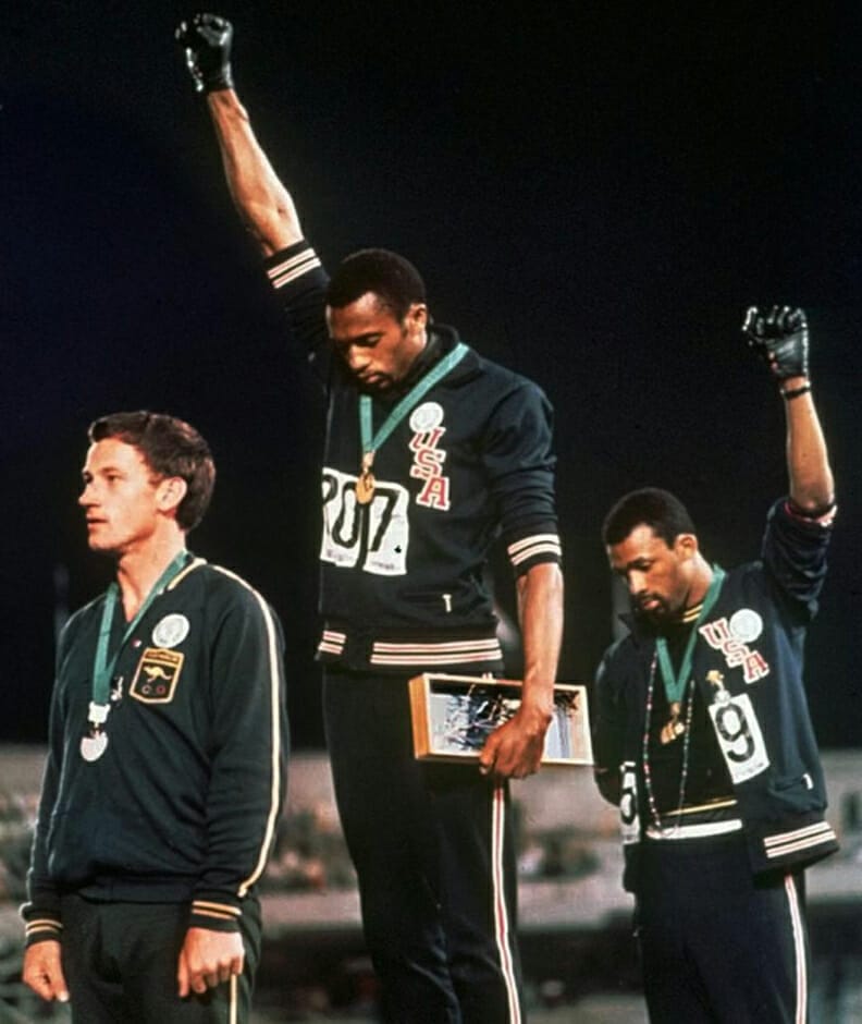 Trong Thế Vận 1968 ở Mexico City, trên bục nhận huy chương, từ trái: Peter Norman, Tommie Smith và John Carlos. Cả 3 người mang nơi ngực trái huy hiệu Dự Án Thế Vận Vì Nhân Quyền, đòi bình đẳng sắc tộc. Hai lực sĩ da đen đi chân trần, đưa tay chào kiểu Sức Mạnh Đen.