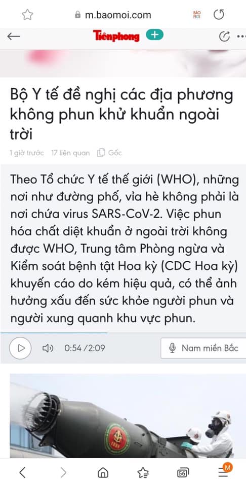 Cũng hôm nay đọc báo nhà nước thấy đăng tin Bộ Y tế đề nghị các địa phương không phun khử khuẩn ngoài trời. Theo Bộ Y tế, Tổ chức Y tế thế giới (WHO) cho rằng những nơi như đường phố, vỉa hè không phải là nơi chứa virus. Việc phun hóa chất diệt khuẩn ở ngoài trời không được WHO, Trung tâm Phòng ngừa và Kiểm soát bệnh tật Hoa kỳ (CDC Hoa kỳ) khuyến cáo do kém hiệu quả, có thể ảnh hưởng xấu đến sức khỏe người phun và người xung quanh khu vực phun. He… he nếu tui nhớ không lầm, chuyện này tui đã nói và viết đăng ở face rồi. Bữa đó xe chạy xịt mù cả phố nơi tui ở, tui nói thì bị nhiều người phê bình là im đi để nhà nước làm, có người còn bảo tui chẳng giúp được gì mà ý kiến ý cò cho lắm. Nghe nói xịt thế cũng tốn tiền ghê lắm chứ không phải chơi đâu.