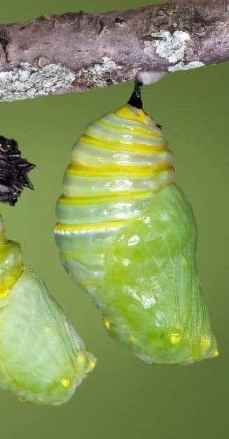 Giai đoạn nhộng là thời kỳ nghỉ ngơi nhưng thực ra là thời kỳ mà bên trong chuyển đổi mạnh mẽ nhất. Nhộng không ăn, không di chuyển và chỉ cần một cái chạm nhẹ nhộng sẽ rơi xuống đất. Bất động bên ngoài nhưng bên trong là một quá trình phân hủy, thay đổi cơ thể. Quá trình này được gọi là histoblast chuyển đổi sâu bướm thành bướm. Bướm trưởng thành, được gọi là imago, xuất hiện từ lớp biểu bì với cái bụng sưng lên và đôi cánh bị nhem nhuốc. Trong vài giờ đầu, bướm sẽ bơm máu vào tĩnh mạch trong cánh để mở rộng cánh. Các chất còn sót lại trong quá trình biến đổi, được gọi là meconium, sẽ được thải ra từ hậu môn. Một khi cánh đã được mở rộng hoàn toàn và được se khô, bướm trưởng thành sẽ bay đi hút mật hoa để sống. Có nhiều giống không ăn chay như vậy mà hút chất lỏng bên trong xác chết của các loài vật, hoặc hút bùn hoặc chất thải của các động vật. Đôi khi chúng hút mồ hôi, nước mắt của rùa và cá sấu vì trong đó có chứa natri làm tăng khả năng sinh sản của bướm. Rồi chúng bay đi kiếm bạn tình. Chúng tìm và bắt cặp với nhau bằng cách khoe màu. Một số loài bướm dùng hương để tìm tới nhau. Hương tỏa ra từ vài miếng vảy trên cánh con đực tạo ra mùi thơm thu hút con cái. Rồi lại đẻ trứng…