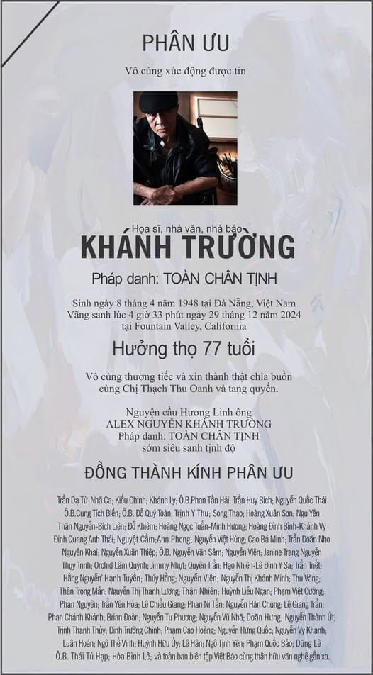 Từ nhà quàn về, tôi nhận được cuốn Ngôn Ngữ Đặc Biệt “Tưởng Niệm Họa Sĩ, Nhà Văn, Nhà Thơ, Nhà Báo Khánh Trường”. Cầm trên tay cuốn báo dày gần 300 trang thấy hụt hẫng. Vậy là bạn ta đã ra đi được ba tháng. Nhớ những e-mail tán hươu tán vượn của gần 100 ngày trước. Thường mỗi sáng, mở iPad là thấy tin nhắn của chàng. Vui ít, chán nhiều. Bạn ta đã thách thức thần chết từ nhiều năm nhưng vẫn phải sống nhăn răng để càm ràm. Nay mới tới giờ anh cầm lưỡi hái làm việc. Anh chàng phải mất ba tuần vất vả mới hái được con người coi trời bằng vung, bệnh rề rề cũng coi như pha. Nhưng những người thân đã không có được cái dũng của anh bạn. Trong bài “Cha Tôi”, cô con gái út Annie Nguyễn Trường An đã viết: “ Những năm tháng cuối tuổi thơ của tôi là một khoảng thời gian mơ hồ. Một sự pha trộn giữa tuổi dậy thì, sự tách biệt của tuổi mới lớn và Mẹ cố gắng hết sức để che chắn, bảo vệ tôi khỏi những điều tồi tệ nhất mà hóa trị gây ra cho Ba. Ban đêm, tôi có thể nghe thấy tiếng Ba nôn mửa và tiếng Mẹ lục đục đóng cửa phòng ngủ để tôi không nghe thấy. Ban ngày, tôi không muốn ở nhà. Tôi thường xuyên đi xa, trốn tránh nỗi buồn của mình và sự đau đớn ẩn sau cánh cửa phòng ngủ đóng kín của Ba Mẹ. Xe cứu thương và xe cứu hỏa ghé đến là chuyện thường xảy ra ở nhà chúng tôi. Những ký ức còn lại của tôi từ thời điểm đó dường như đã bị chặn lại. Tôi không biết nên cảm thấy xấu hổ hay biết ơn. Dần dần, từng ngày, tôi cảm thấy Ba đang dần rời xa tôi, và tôi cũng dần rời xa Ông. Ba càng trở nên khép kín, tôi càng dần dần trở nên chấp nhận sự suy yếu của Ông. Ba càng tránh xa, Ba càng chuẩn bị tốt hơn cho tôi để tạm biệt”.