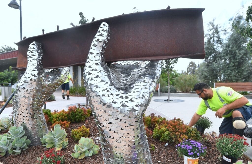 Tác phẩm từ thép của tòa nhà Twin Towers của điêu khắc gia Heath Satow tại Rosemead, California.