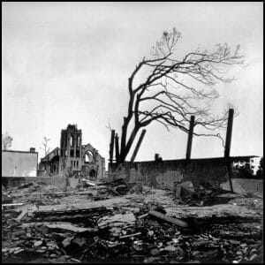 Thành phố Hiroshima (sau vụ ném bom khỏang chừng một hay hai tháng) nhìn từ phía Higi-Yama, một ngọn đồi tọa lạc ở phía đông thành phố.
