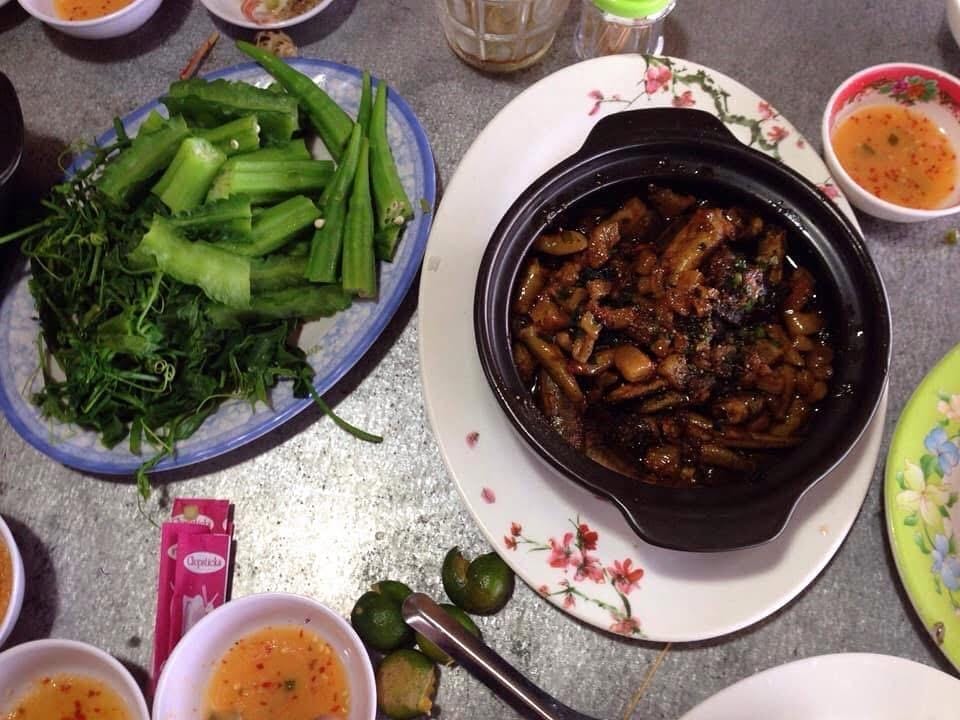 Nhưng… không sao. Bỏ qua cơm đi, không lên ảnh thì không nói; mình kể chuyện “Cá bống kho tộ” vậy, vì “ảnh” đã lên phây. Chỉ nhìn thôi, đã thấy hấp dẫn lắm rồi. Dù tác động “ngoại cảnh” gió sông vun vút thổi, khí trời lành lạnh, dưới mái lá lợp bằng dừa nước, khung nhà không vách, nhìn ra xa dòng sông Vàm Cỏ Đông chảy xuôi ra cửa biển, lặng lờ cuốn theo những đám lục bình điểm hoa tím ngát đã thấy sự lãng mạn dâng tràn, nhưng vì đã quá 6g chiều, ai cũng đói ngấm, đói ngầm; giờ có món ăn ấm nóng là cả một trời hào hứng, nên ai cũng chúi mũi vào tộ cá, thử, ngon lắm: thật vừa miệng, ngọt vừa, béo đủ, nước kho keo sệt đủ để chấm những đọt rau xanh um, tươi mượt; cá tươi, thịt vừa săn vừa ngọt, thật tuyệt vời… đang đê mê vậy, chợt Bi la lên như bắt được vàng: