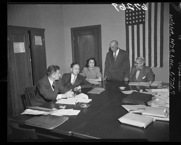 Phiên điều trần về vấn đề nhập cư năm 1950 để xác định liệu Tiền Học Sâm, người thứ hai từ trái sang, có nên bị trục xuất hay không. Ảnh: Los Angeles Times Photographic Archive/UCLA Library Special Collections