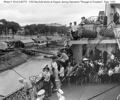 Tàu USS Bayfield neo tại Sài Gòn để đưa dân tỵ nạn xuống đất liền sau hành trình từ Hải Phòng, Tháng Chín 1954. (Hình: US Navy Department)