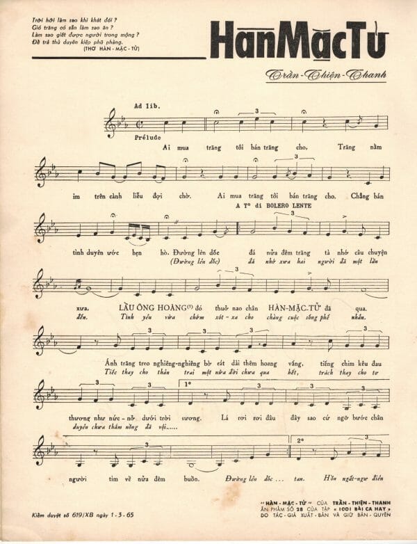 “. . .Bài hát “Hàn Mặc Tử” này đã trở nên thật nổi tiếng ở Việt Nam kể từ lúc được ca sĩ Trúc Mai trình bày ở Đại nhạc hội tại rạp hát Thanh Bình, Sài Gòn vào năm 1965. Sau đó bài hát này được phổ biến rộng rãi khắp mọi nơi cho đến tận ngày hôm nay. Đi đâu cũng nghe người ta hát “Ai mua trăng, tôi bán trăng cho…” từ nhà hàng, quán cà-phê, bến xe đò, bến phà, các xe bán hàng rong khắp hang cùng ngõ hẻm.. .”
