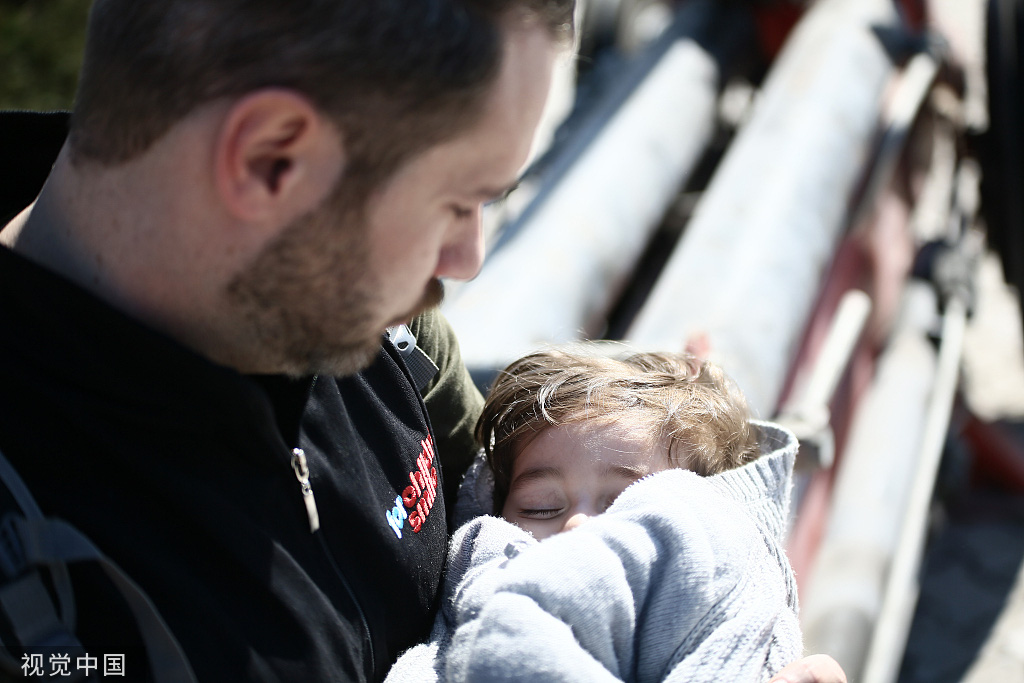 Em bé 3 tuổi ngủ trong vòng tay của một tình nguyện viên cứu trợ đến từ Thụy Sĩ sau trận động đất ở tỉnh Hatay, Thổ Nhĩ Kỳ hôm 8-2 – Ảnh: VCG