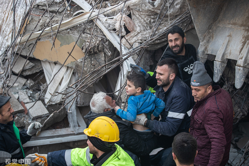 Nhân viên cứu hộ đưa cậu bé Yigit Cakmak (8 tuổi), người sống sót trong động đất, cho chú của cậu bé tại hiện trường một tòa nhà bị sập ngày 8-2, 52 giờ sau khi trận động đất xảy ra ở tỉnh Hatay, phía nam Thổ Nhĩ Kỳ – Ảnh: VCG