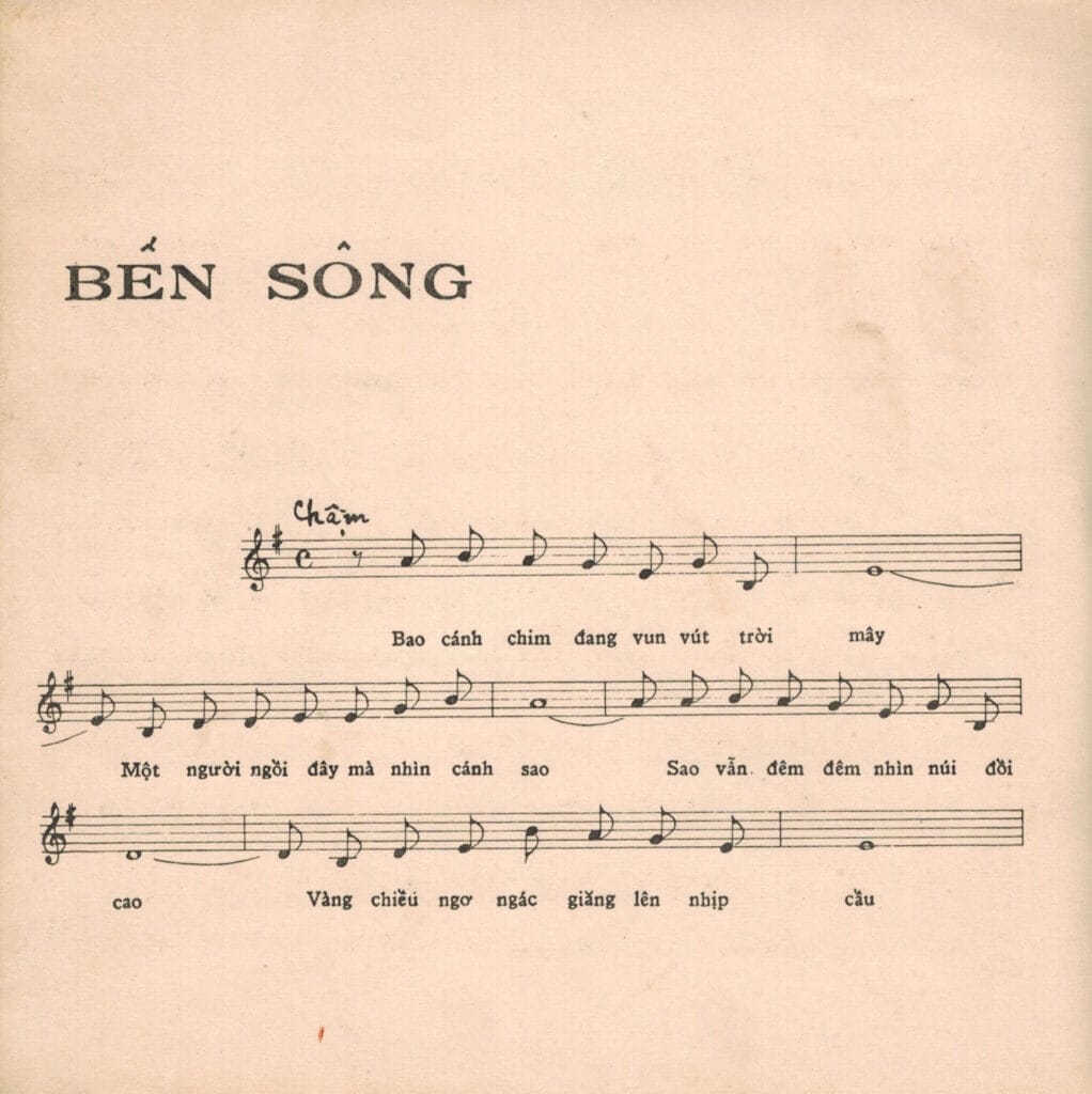 Bao cánh chim bay vun vút trời mâyMột người ngồi đây mà nhìn cảnh saoSao đêm cô đơn nhìn núi đồi caoBuồn chiều ngơ ngác giăng lên nhịp cầuBến sông này ngàn năm che kín đàn tôiNgười xưa bây giờ còn hoài cổAi quay về nghe giọng hò hát Nam ai,Nam bình nghe nỗi buồn vu vơNhư áng mây trôi về phố chiều nayNụ cười hồn nhiên nở trong phố nâuÁo trắng lung linh lộng gió trời caoNgẩn ngơ đàn bướm quay lui vườn đào.