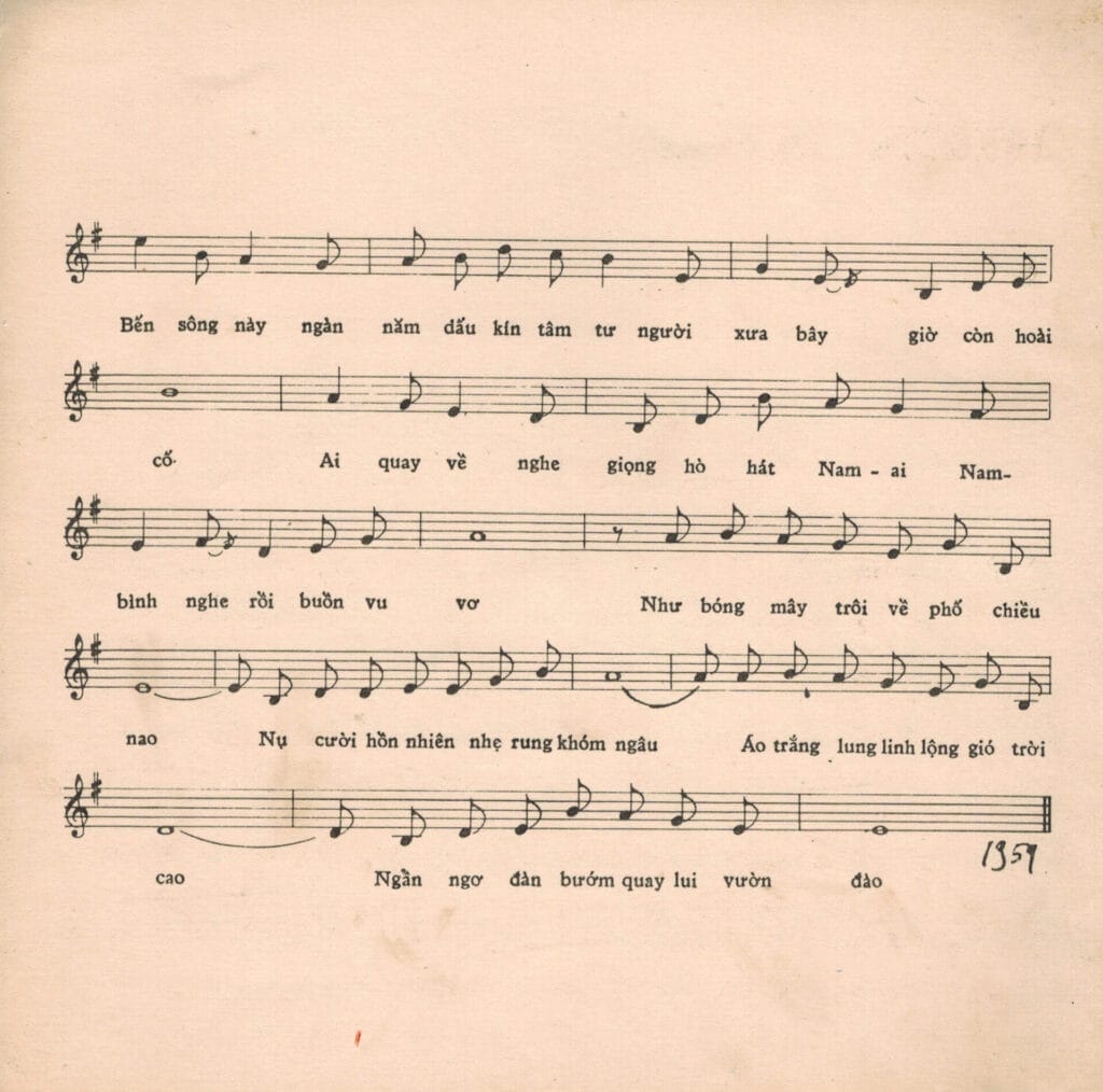 Bao cánh chim đang vun vút trời mâyMột người ngồi đây mà nhìn cánh saoSao vẫn đêm đêm nhìn núi đồi caoVàng chiều ngơ ngác dâng lên nhịp cầuBến sông này ngàn năm dấu kín tâm tưNgười xưa bây giờ còn hoài cổAi quay về nghe giọng hò hát Nam Ai,Nam Bình, nghe rồi buồn vu vơNhư bóng mây trôi về phố chiều naoNụ cười hồn nhiên nhẹ rung khóm ngâuÁo trắng lung linh lộng gió trời caoNgẩn ngơ đàn bướm quay lui vườn đào.