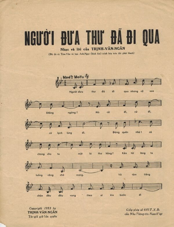 Khi chúng tôi xem lại các chi tiết trong bản nhạc gốc, thì bản nhạc được xuất bản năm 1953, tức năm nhạc sĩ Nhật Ngân mới 11 tuổi (ông sinh năm 1942); cũng theo tiểu sử nhạc sĩ, thì bản nhạc đầu tay của ông là bài “Tôi đưa em sang sông” ra mắt công chúng yêu nhạc năm 1960. Theo chúng tôi suy đoán, có thể người phụ trách trang Web của nhạc sĩ Nhật Ngân (sau khi ông qua đời) đã nhìn cái tên TRỊNH-VĂN-NGÂN (tác giả bản nhạc NGƯỜI ĐƯA THƯ ĐÃ ĐI QUA) và cho là của Trịnh Lâm Ngân chăng? Mặt khác, căn cứ trên bìa sau của tờ nhạc, Trịnh Văn Ngân còn là tác giả của một số nhạc phẩm như bức hình dưới đây cho biết: