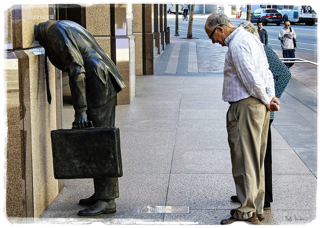 Nghệ sĩ Terry Allen đã tạo ra một tác phẩm điêu khắc bằng đồng có kích thước thật về một người đàn ông mặc vest công sở và mang theo một chiếc cặp trên tay trái. Doanh nhân đang cúi xuống, cúi đầu và vùi đầu vào nền móng vật lý của tòa nhà, tượng trưng cho lòng trung thành của anh ta với cấu trúc công ty. Người đó tách biệt với tòa nhà văn phòng chỉ từ cổ trở xuống, cho thấy anh ta đã bị tiêu thụ tinh thần bởi lợi ích của cơ sở.
