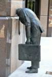Scultura in bronzo di un uomo d’affari con valigetta e con testa incastrata nel muro.