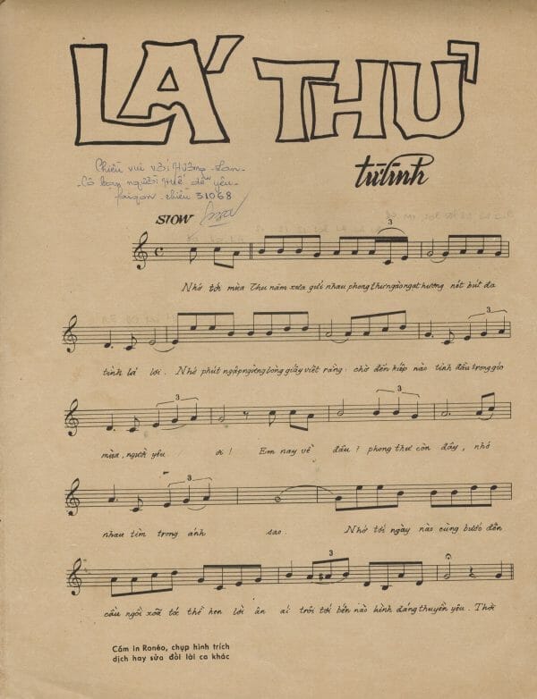 Trong một chuyến về thăm quê nhà gần đây nhất, tôi lại được người Sài Gòn cũ gởi gắm hồn của những người trẻ năm xưa còn sống ở quê nhà. Trẻ năm xưa nhưng nay đã là những ông bà lão tóc hai màu. Dầu vậy, hồn Sài Gòn cũ vẫn như ngày nào trước khi có cuộc đổi đời. Nó không mất, không bị “cải tạo”. Nó vẫn sừng sững tồn tại trong những ấn phẩm văn hóa trước 1975 sống sót qua cuộc phần thư tàn khốc. Nó sống sót được là nhờ ở lòng dân. Nhờ vậy, hôm nay đây tôi may mắn “sở hữu” hồn Sài Gòn ấy qua kho tài sản vô giá : hàng mấy trăm bài nhạc cũ in trước 1975, với cả thủ bút , chữ ký của các nhạc sĩ tác giả, với cả những hàng chữ viết tay của người chủ sở hữu năm xưa ghi lại kỷ niệm của riêng mình.