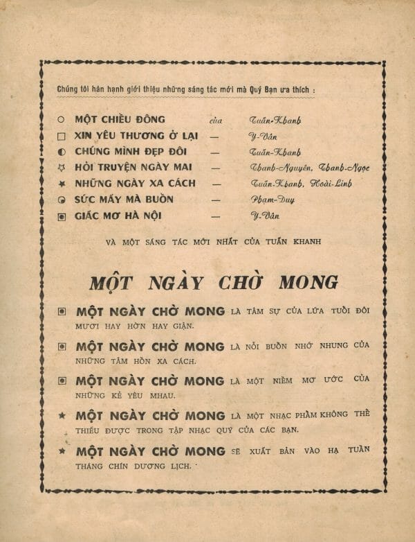 Trong một chuyến về thăm quê nhà gần đây nhất, tôi lại được người Sài Gòn cũ gởi gắm hồn của những người trẻ năm xưa còn sống ở quê nhà. Trẻ năm xưa nhưng nay đã là những ông bà lão tóc hai màu. Dầu vậy, hồn Sài Gòn cũ vẫn như ngày nào trước khi có cuộc đổi đời. Nó không mất, không bị “cải tạo”. Nó vẫn sừng sững tồn tại trong những ấn phẩm văn hóa trước 1975 sống sót qua cuộc phần thư tàn khốc. Nó sống sót được là nhờ ở lòng dân. Nhờ vậy, hôm nay đây tôi may mắn “sở hữu” hồn Sài Gòn ấy qua kho tài sản vô giá: hàng mấy trăm bài nhạc cũ in trước 1975, với thủ bút, chữ ký của các nhạc sĩ tác giả, với cả những hàng chữ viết tay của người chủ sở hữu năm xưa ghi lại kỷ niệm của riêng mình.