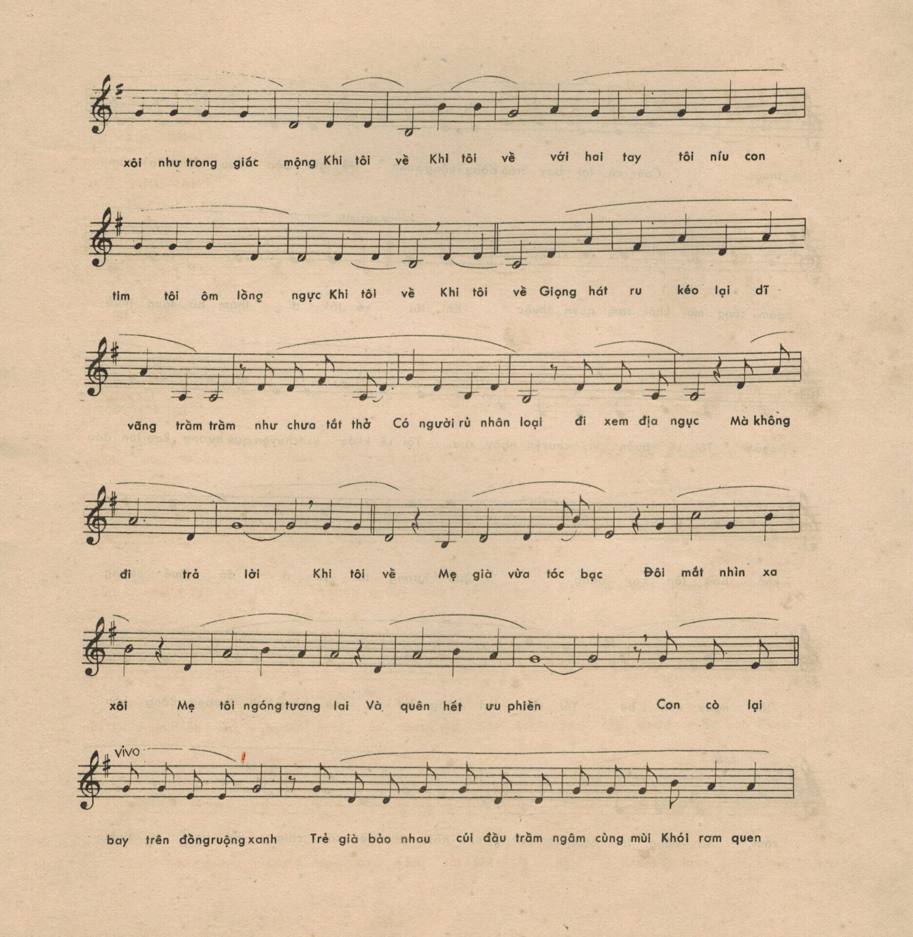 “Khi tôi về, con chim câu nằm trong tổ ấm – Dây thép gai đã hết rào quanh đồn phòng ngự – Và người lính đã trở về cày đám ruộng xưa – Khi tôi về, con diều bay đùa trong gió – Chốn quê nhà trên thảm cỏ xanh – Có lũ trẻ để bụng lòi rốn đen, cười thanh bình – Khi tôi về, có con trâu rung mõ xa xôi như trong giấc mộng – Khi tôi về, với hai tay tôi níu con tim tôi ôm lồng ngực – Khi tôi về, giọng hát ru nối lại dĩ vãng trầm trầm như chưa tắt thở – Có người rủ nhân loại đi xem địa ngục mà không ai trả lời – Khi tôi về, mẹ già vừa tóc bạc, đôi mắt nhìn xa xôi – Mẹ tôi ngóng tương lai và quên hết ưu phiền – Con cò lại bay trên đồng ruộng xanh – Tre già bảo nhau cúi đầu trầm ngâm – Cùng mùi khói lam quen thuộc…”