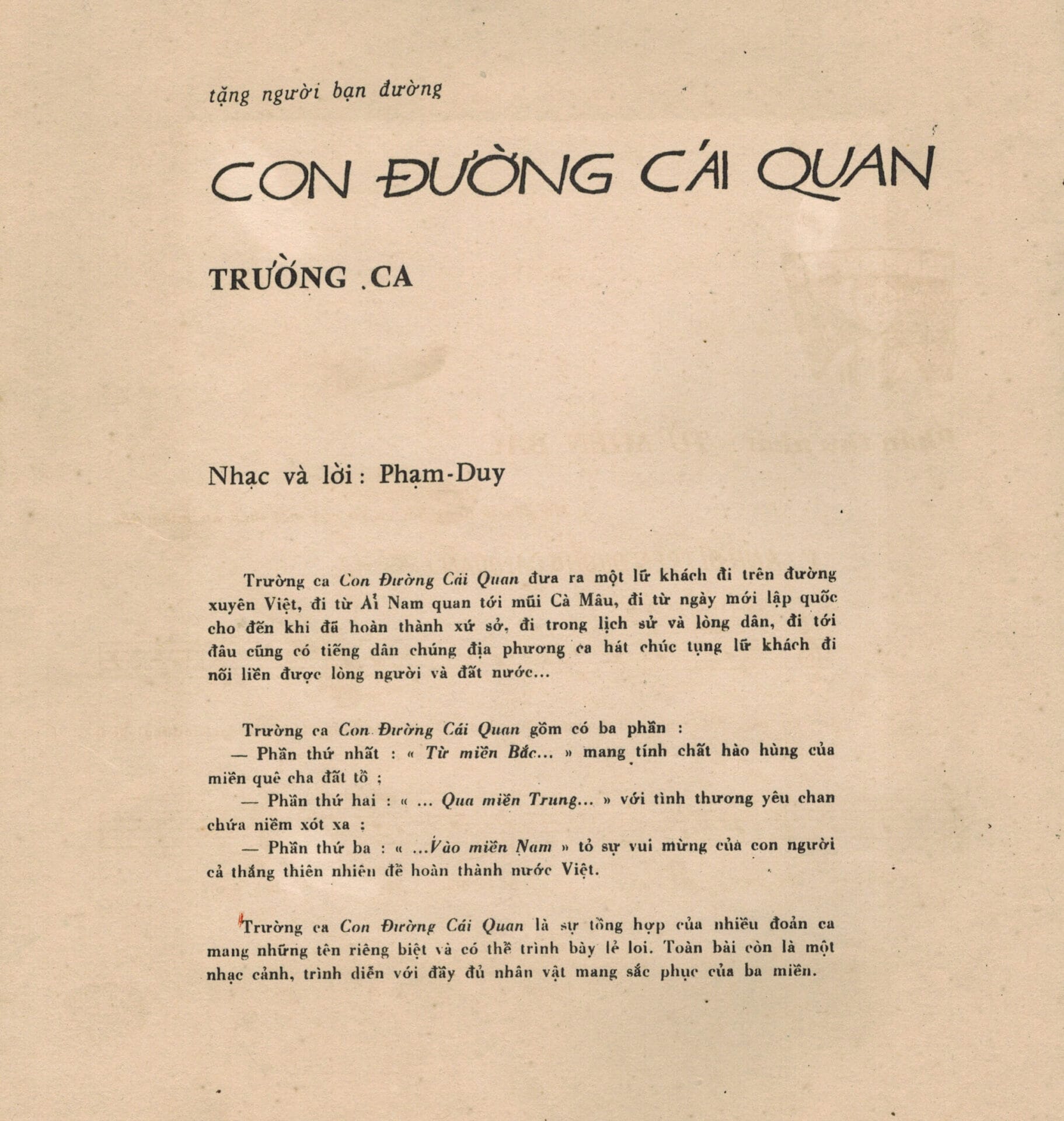 Trường Ca CON ÐƯỜNG CÁI QUAN được thai nghén từ 1954, vào lúc các cường quốc vừa chia đôi nước Việt Nam ra thành hai miền Quốc-Cộng với bản Hiệp Ðịnh Geneve. Tôi đang đi học nhạc tại Paris và bằng trường ca này, tôi phản đối sự chia cắt đó. Vào năm 1960, tôi hoàn tất phần còn lại của Trường Ca CON ÐƯỜNG CÁI QUAN.