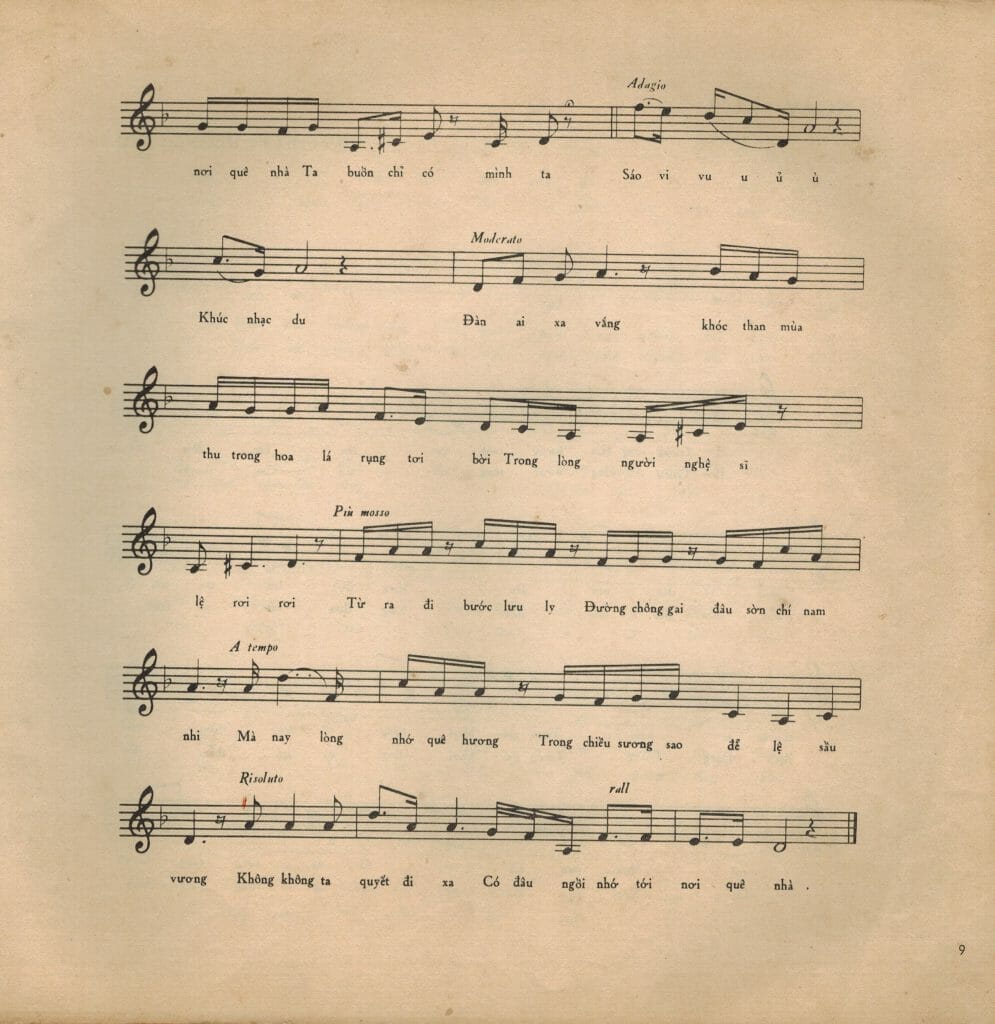 Năm 1944, ca khúc “Lời du tử” ra đời trong khoảnh khắc tha hương, in đậm dấu ấn tâm hồn của thế hệ thanh niên trí thức trước cách mạng, luôn cô đơn, khao khát những chân trời. Đến “Bình ca”, sáng tác năm 1947, cho thấy một tầm vóc âm nhạc, một chí khí, một tinh thần dân tộc hào sảng, đằng sau đó là sự nao nức của người nghệ sỹ dùng âm nhạc phụng sự Tổ quốc mình, Nhân dân mình. Âm hưởng của “Bình ca” được tiếp nối đầy hân hoan, làm thành “Chiến sỹ sông Lô”, “Hữu ngạn sông Thao”… thời kháng chiến chống Pháp, “Nhớ anh giải phóng quân”, “Cùng nhau đi đầu quân”, “Bô lão chúng ta còn dẻo dai”… thời kháng chiến chống Mỹ. Từ đó, đến “Nhớ quê hương”, và đặc biệt, với “Tiếng đàn bầu” là sự hợp thành của bao cung bậc cảm xúc, da diết, đau đáu niềm yêu con người, yêu tâm hồn dân tộc: “Cung thanh là tiếng mẹ/ Cung trầm là giọng cha”…