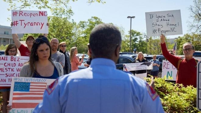 Đáp lại, tại hơn chục bang đã xảy ra các cuộc biểu tình phản đối phong tỏa, khi mà hàng ngàn người Mỹ bảo thủ và cực hữu đòi dỡ bỏ các hạn chế đi lại, bất chấp cái giá phải trả về y tế.